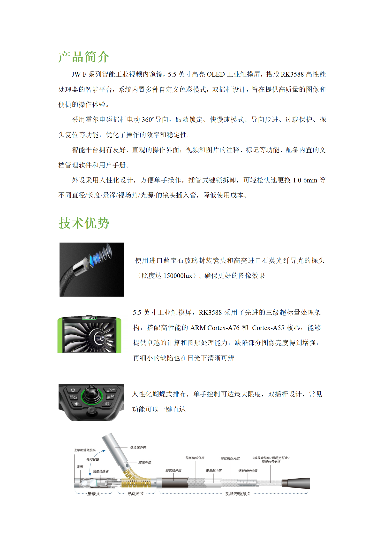 JW-F系列智能工業(yè)視頻內(nèi)窺鏡,5.5英寸高亮OLED工業(yè)觸摸屏,搭載RK3588高性能處理器的智能平臺(tái),系統(tǒng)內(nèi)置多種自定義色彩模式,雙搖桿設(shè)計(jì),旨在提供高質(zhì)量的圖像和便捷的操作體驗(yàn)。